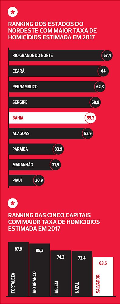 Em junho deste ano, o Atlas da Violência 2019 apontou que homens, negros e jovens - com menos de 30 anos - são a maioria das vítimas de homicídios ocorridos na Bahia em 2017. Dentre as 7.487 vítimas de assassinatos registrados pela pesquisa naquele ano, 7 mil eram homens (93% do total), 6.798 negros (90%) e 4.522 tinham entre 15 e 29 anos (60%). Em todo o Brasil, foram 65.602 mortes em 2017, contra 62.517 no ano anterior – o que corresponde a aumento de 4,9%.